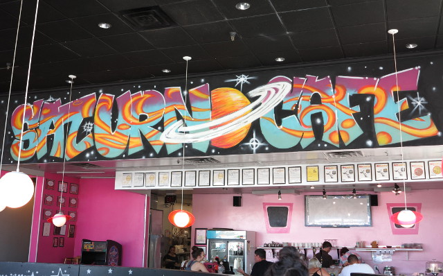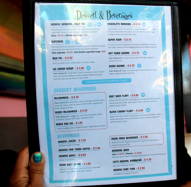 Kaupunki vaikutti kivalta ja jonkinlainen vegaanivaistoni löysi sattumalta kasvis-dinerravintola Saturn Cafen. Kaliforniakokemukseen kuuluu tämmöiset googie-tyyliset dinerit ja tämä edusti sitä oikein hyvin. Menu oli kasvisroskaruokaa, kaikki ei ollut vegaanista, mutta menussa olisi ollut vaikka mitä. Jos Yhdysvalloissa olisi ravintolaruoka halvempaa, olisin varmaan vetäissyt vielä jälkiruoaksi pirtelön ja kakkua, mutta tyydyin salaattiin. Saturn Cafe Happy Cowssa >>
