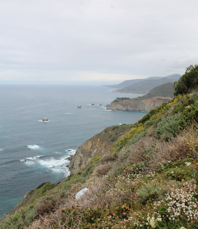 Mutta näimme valaita kauempana merellä. Niitä näkyi Montereystä etelään useammissakin kohdissa. Ihan auton kyydistä merelle tuijotellen äkkäsimme kaukana klassisia pieniä vesisuihkuja, joita valaat päästävät. Sitten niitä näkyi vähän joka maisemapysähdyspaikalla merelle tiukasti katsoessamme. Selkiäkin näkyi, mutta ei pyrstöjä. Ja kaikki kaukaa. Mutta oli kiva ajatella valaiden uivan siellä vesissä. Ne olivat ehkä harmaavalaita, joita voi nähdä noilla merillä lähinnä maaliskuulle asti, tai ryhävalaita, joita alkaa esiintyä huhtikuusta lähtien.