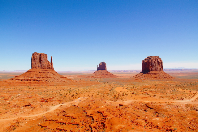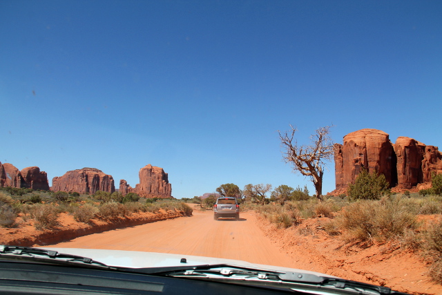 Koska Monument Valley sijaitse navajomailla, ei sinne päässyt sisään kansallispuistopassillamme, joten pääsymaksu piti maksaa erikseen. Sillä pääsi alueelle ja sai ajaa siellä olevan rengasreitin, jolle ei millä tahansa autolla kannattaisi lähteä (matkailuautolla ei pääsisi). Tarjolla oli myös jonkinlaisia turistikyytejä avonaisessa kärryssä, mutta pöllyävän punaisen hiekan keskellä se ei näyttänyt hyvältä idealta.