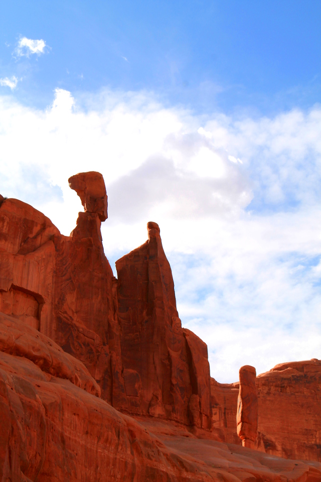 archesin muodostelmiaArchesin kansallispuiston sisäänkäynnillä on vierailijakeskus ja sieltä lähtee tie ylös jännästi kallioseinämän vierustaa. Moab ja sieltä pohjoiseen päin johtava tie sijaitsee Moabin kanjonissa, joten molemmin puolin kohoaa louhitun näköiset seinämät. Näyttää tosiaan kuin Moab sijaitsisi ihmisen tekemässä isossa montussa, jotenkin nuo kalliot eivät olleet mitenkään erityisen kauniit.