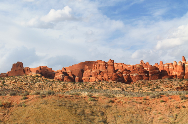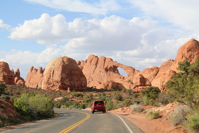 Koska ei ollut vielä liian myöhä, lähdimme suoraan Archesin kansallispuistoon saavuttuamme Moabiin ja kirjauduttuamme motelliin. Samana päivänä olimme jo ajelleet Coloradossa Cortezista Mesa Verden kansallispuistoon ja sieltä ajettu Utahiin Moabiin. Ei ollut tarkoitus ahnehtia Archesia samana päivänä, mutta uteliaisuudesta lähdimme sinne käymään ja tulimme sitten ajelleeksi puiston läpi meneviä teitä siihen malliin, ettemme sinne enää seuraavana päivänä palanneet.