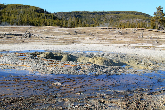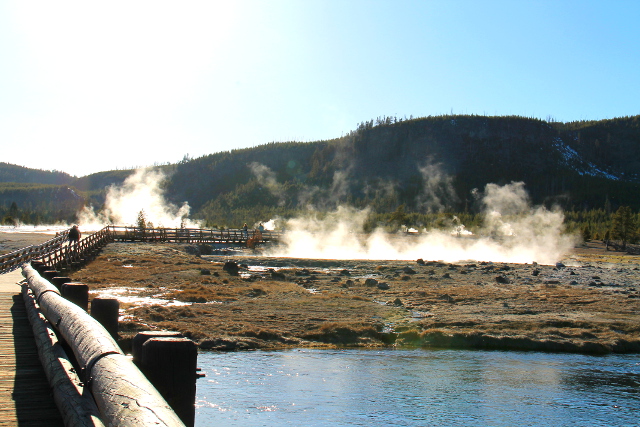 Koska vierailuajankohtamme oli viileä, näimme vain lähinnä höyryä. Eikä maantasalta tästä muutenkaan olisi saanut semmoista kokonaiskuvaa kuin mitä ilmasta tulisi. Paikalla pitäisi olla korkea torni, josta voisi ihailla näkymää. Lähteen vierellä kulkeva polkukaan ei voi mennä kovin lähellä, koska eihän nyt kuuman lähteen päälle voi rakentaa, eikä pidäkään. Yellowstonessa muutenkin on vaikeutena suojella kuumia lähteitä ettei porukka pudottele sinne objekteja, jotka voivat tukkia lähteen.