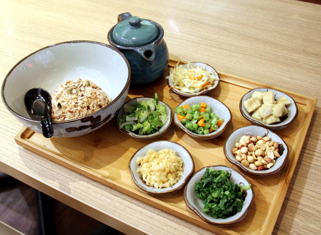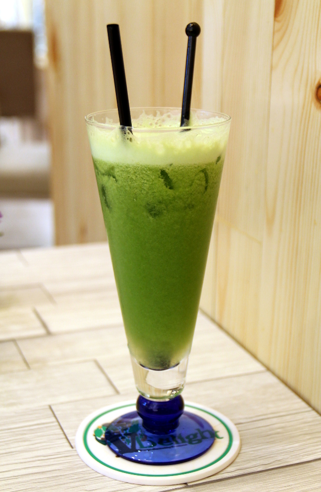 En tykkää vihreästä teestä kuin teenä vain ja mieluiten maustettuna. Eli kaikenlaiset vihreäteiset jäätelöt, karkit, suklaat, makeat soijamaitojuomat ja sen sellaiset eivät vain maistu hyvälle. Nyt oli silti kokeiltava Simple Lifen signature-annosta lei chata, koska se oli minulle ihan uusi ilmiö. Siihen kuului päänumerona keitto, jossa on muun muassa vihreää teetä, basilikaa ja minttua. Lisäksi tuli riisiä ja seitsemän pientä kupillista lisäkkeitä, joihin kuului tofua, maapähkinöitä, kaalisalaattia, vihreäpapu-porkkanaa sekä kahta eri lehtivihannespaistosta, kaikki hyvin maustettuja. Halusin antaa mahdollisuuden kummalliselle uudelle ruokalajille, mutta ei se ollut minun juttuni. En syönyt kaikkea keittoa, mutta onneksi oli lisäkkeet riisin kanssa.