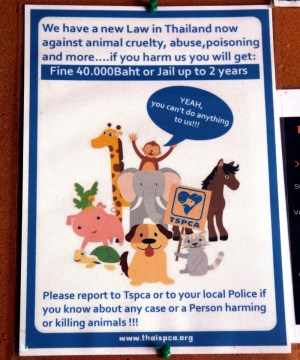 Minulle näytettiin eläinten tiloja, jotka olivat samanlaista kuin muualla Thaimaassa näkemäni. Heillä oli kohtuullinen määrä koiria ja kissoja, joille joko etsitään uudet kodit tai palautetaan sinne mistä ne on löydettykin, mikäli ne voivat jatkaa elämäänsä entiseen tapaan. Toisin kuin Suomessa, Thaimaassa ei oteta irtokoiria talteen. Niitä on yksinkertaisesti aivan liikaa ja elämä on ei-halutuille koirille mielenkiintoisempaa vapaana kuin betonihuoneissa. Tosin Thaimaassa ja monissa muissa maissa koiria ei pidetä pienissä yhden koiran kenneleissä, vaan usein ulkotarhoissa muiden koirien kanssa, jotka on totutettu toisiinsa.