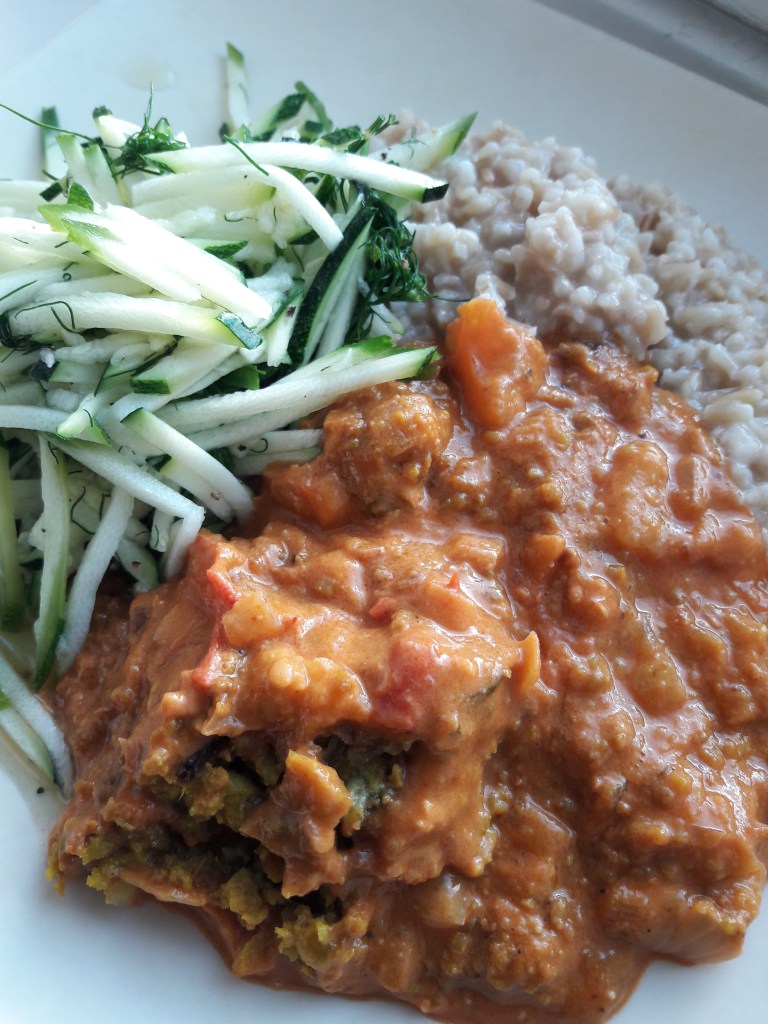 Kaurahelmiä, kesäkurpitsasalaattia (suola-sokeri-etikkat-tilli) ja malai kofta -tyyppistä kastiketta pyöryköineen.
