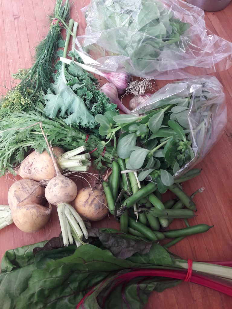 Kesällä Oma maasta saa tuoretuotteita. Tässä yhden viikon satsi: keräsalaattia, valkosipulia, vihannesportulakkaa, härkäpapuja, mangoldia, naurista, vihanneskrysanteemia, lehtikaalia ja tilliä.