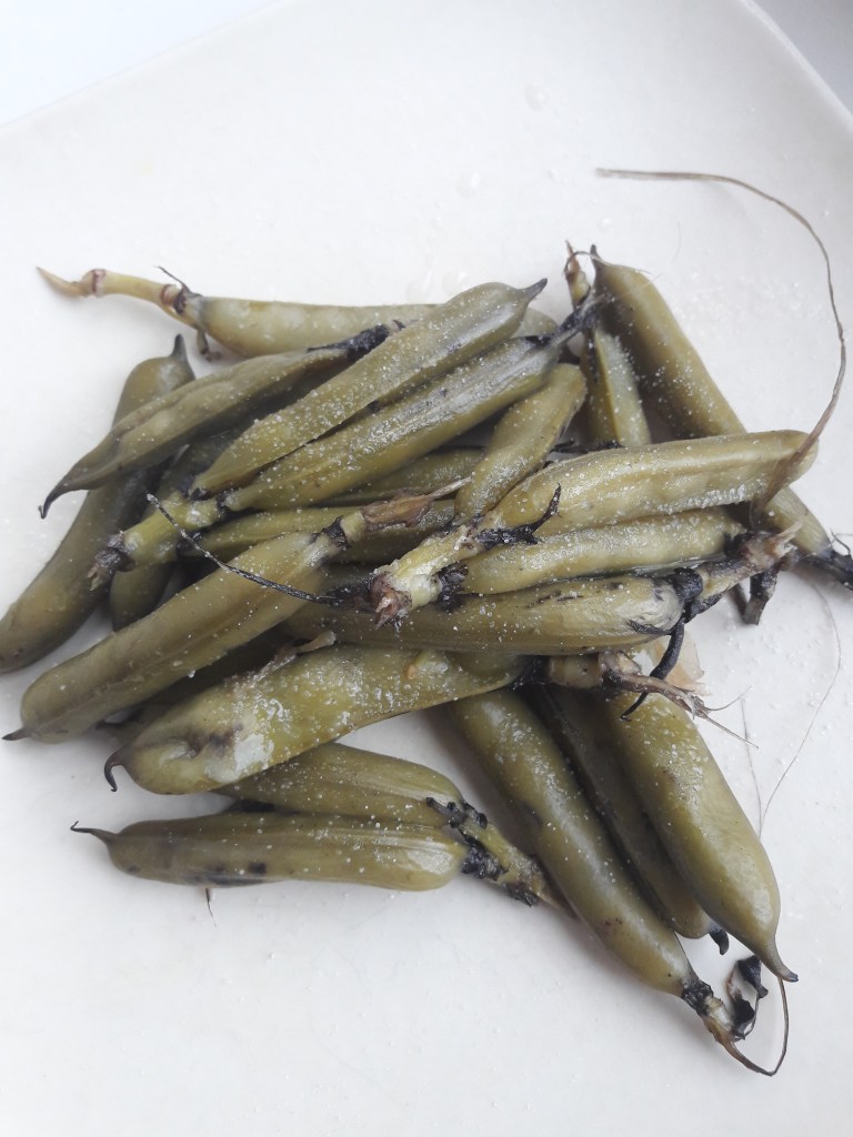 Nyt on tullut joka viikko härkäpapusatoa, härkäpapuja on paria eri kokoa. Olen eniten vain keittänyt niitä palkoineen ja sitten suolannut ja syönyt kuten soijapapu-edamamet.