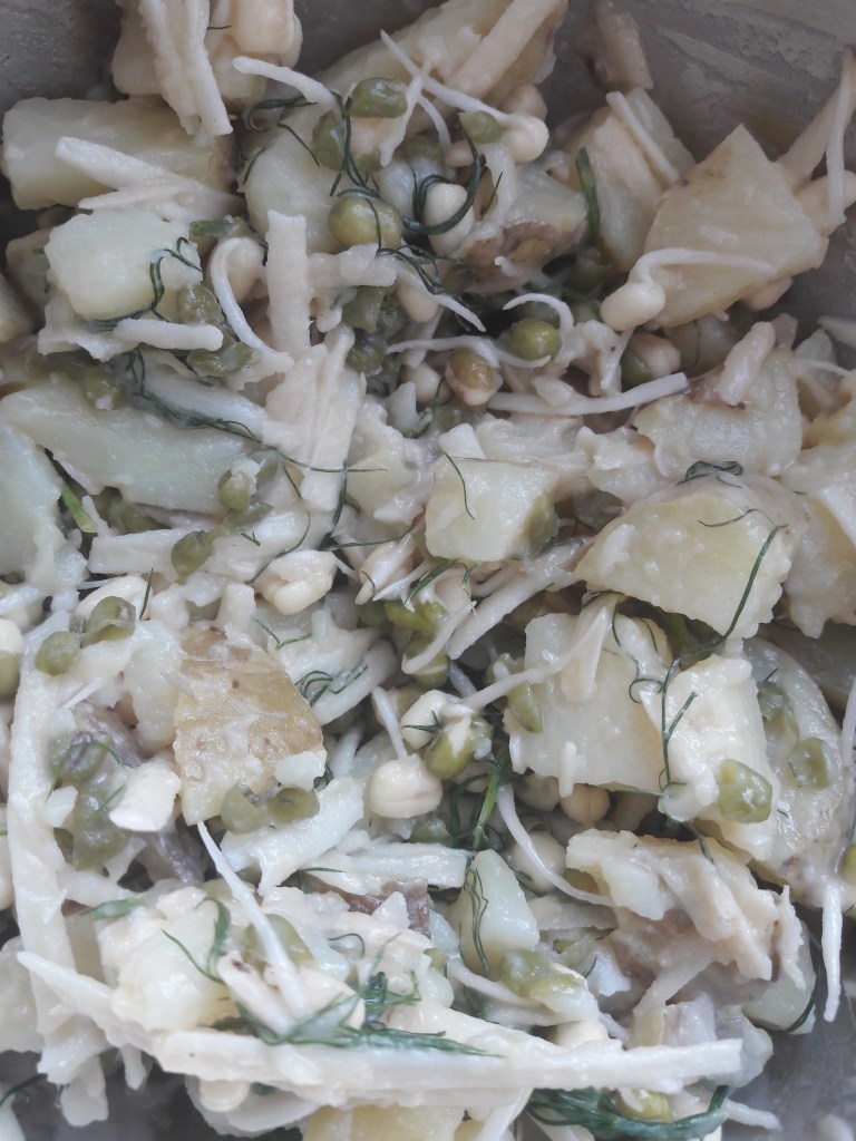 Perunaa ja tilliä on tullut paljon. Tässä salaatti niistä ja mungpavun iduista, mukana Violifen vegaanijuustoa ja salaatinkastiketta.