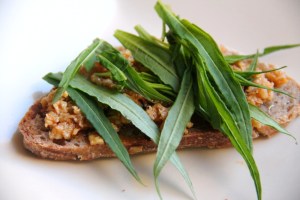 Leipä, jonka päällä on Oma maan seitanmurutuotetta ja horsmanlehtiä. Horsman lehdet yllättävän hyvin soveltuvat leivälle salaatin sijaan.