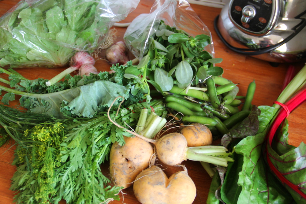 Ehkä paras puoli tässä on se, että ei tarvitse miettiä mitä sitä ostaisi. On hauska odottaa, mitä sieltä milloinkin tulee. Joskus yli 15 vuotta sitten tilasin välillä Ruohonjuuren kautta kasviskassin, jossa samalla tavalla sain yllätyssatsin luomuvihanneksia. Oma maasta haen kerran viikossa semmoisia vihanneksia, joita ei niin paljoa tule itse kaupasta ostettua, vaikka vaihtelu olisi kivaa. Nyt olen saanut käyttää mielikuvitustani kokkailemalla nauriista, hernerouheesta, kaurahelmistä ja mangoldista. Sieltä on myös tullut sellaisia vihanneksia, joita en ole ennen tuntenut, kuten lehtikaalin tapaisia rapsin lehtiä, vihanneskrysanteemia (siitä en niin välittänyt) ja uutta lemppariani vihannesportulakkaa. Kesäkuussa tuli villivihanneksia, kuten takiaisen vartta. Sen jälkeen koko kesän ajan koitin skannata luonnosta takiaisia ja yritän vieläkin tajuta ohdakkeiden (jotka ovat  myös syötäviä) ja takiaisten eroa. Eli helppous ja mielenkiintoisuus ovat yksi peruste tässä.