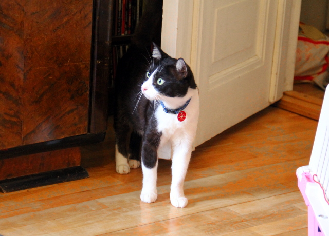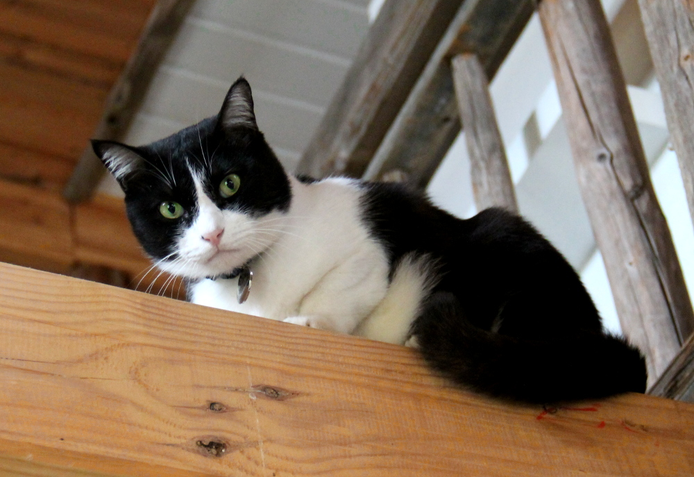 Koirien kanssa ei mene ihan ongelmattomasti, Greippi-poikaa ärsyttää Billyn läsnäolo paljon ja se uhittelee Billylle (tähän tietysti yritetään keksiä koulutuskeinoa). Billyä taas ei kiinnosta yhtään varoa koiria, vaan se käppäilee koirien keskelle milloin huvittaa ja lymyilee kulmien takana valmiina moukuttamaan ohikulkijoita. Ruoanhimo on sillä kova, varmasti tylsistyttää. Sillä on paljon lymypaikkoja, kuten takan päällä ja vaatehuoneen hyllyillä, ja yöt se nukkuu parvella, ellei sitten bailaa eteisessä. Pääsääntöisesti se herättää kello 6.30 joka aamu, koska niihin aikoihin olen laittanut itselleni herätyksen arkiaamuisin. Se hyppii parvelta alas, kiehnää ja vaikka muuten en hyvät unenlahjat omaavana heräisi hommaan, niin minun pitää kuitenkin varoa, ettei Billy mene tökkimään koiria ja siksi siinä sitten pitää nousta antamaan ruokaa.