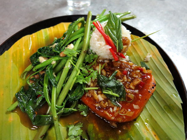 Tämä ruokalaji edustaa edellisen tavoin vähän harvinaisempia ruokia, ehkä fuusioruokia. Olen varta vasten mennyt Time for Limen ravintolaan syömään niinä iltoina, kun tätä ruokaa on ollut tarjolla. Voisi luulla, että olisi överiä syödä niin paljon yrttejä, kuten sitruunaruohoa, kaffirlimenlehtiä, inkivääriä ja valkosipulia, mutta tämä on sellainen yhtä aikaan raikkaan suolaisen makea ja mausteinen sekoitus. Parhaita ruokia mitä olen Thaimaassa saanut. Time for Limessa tämäkin syötiin bataatin kanssa. Kotona olen syönyt tätä esimerkiksi tofun ja perunan kanssa.