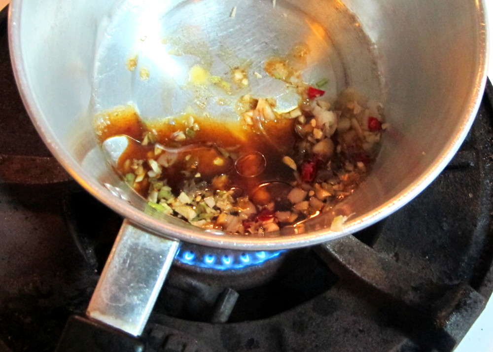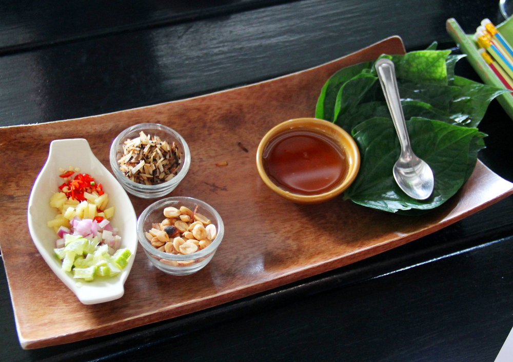 Ensin menimme opettajan kanssa yläkerran terassille käymään läpi thaimausteiden perusteita ja syömään pippurin lehtiin käärittyä mieng kamia, joka on varsinaista näpertelyruokaa. Kasvisvaihtoehdot on otettu hyvin huomioon. Meille esiteltiin kaikkein parhaan makuinen soijakastike, joka on Healthy Boy Brandin sieni-soijakastike. Ollessani aiemmin Bangkokissa May Kaidee´sin kasviskokkikurssilla, opin siellä että saman merkin sienikastike on helpointa täydellistä paistettujen vihannesten maustetta. Time for Limen kurssilla opin nyt myös sen, että paitsi että currytahnoissa on yleensä katkaraputahnaa ja/tai kalakastiketta, niin näitä on myös chilitahnoissa. Time for Limessa käytetään useasta paikasta löytyvää Mae Pranomin chilitahnaa, josta löytyy myös kasvisversio, joskin sitä on usein vaikea löytää.