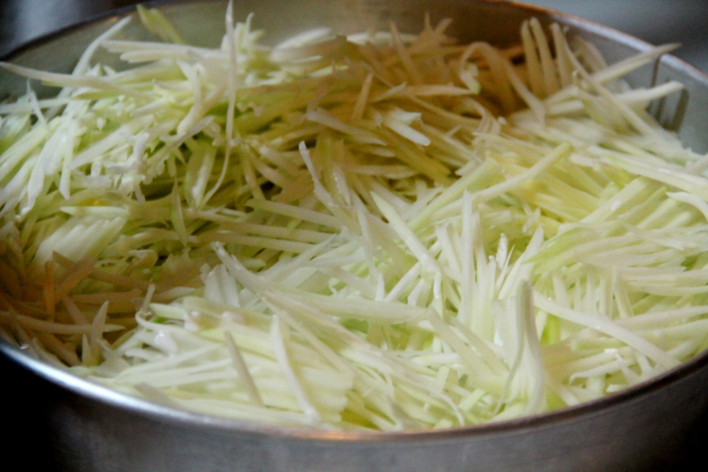 Thairuokaan vihkiytymätön saattaa luulla saavansa hedelmäsalaatin oranssista papaijasta, mutta ei, som tam tehdään raastetusta raa´asta papaijasta. Samalla tavalla tätä voi tehdä raa´asta mangosta. Mutta mielestäni vihannekset eivät ole tässä salaatissa oleellisin asia, vaan muiden ainesten ansiosta syntyvä ihana maku. Olen tehnyt samalla liemellä salaattia mistä vain. Mutta jos haluaa enemmän samantapaista, niin ehkä pieneksi suikaloitu kurkku ja porkkana voisivat olla hyvät.