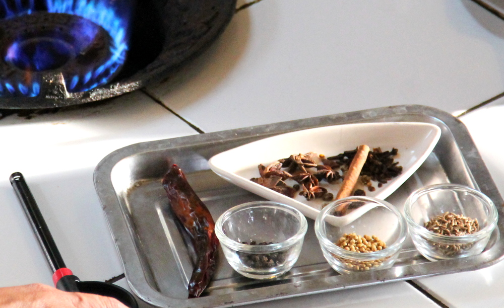 Ensin kurssilla tutustutaan aineksiin ja perusmaustamiseen. Aineksia joutuu itse pilkkomaan tosi vähän, vain sen mitä tarvitsee esimerkiksi oppiakseen murskaamaan oikealla tavalla aineksia, kuten valkosipulia. Yleensä opetellaan jonkin currytahnan tekeminen huhmareessa jauhamisineen.