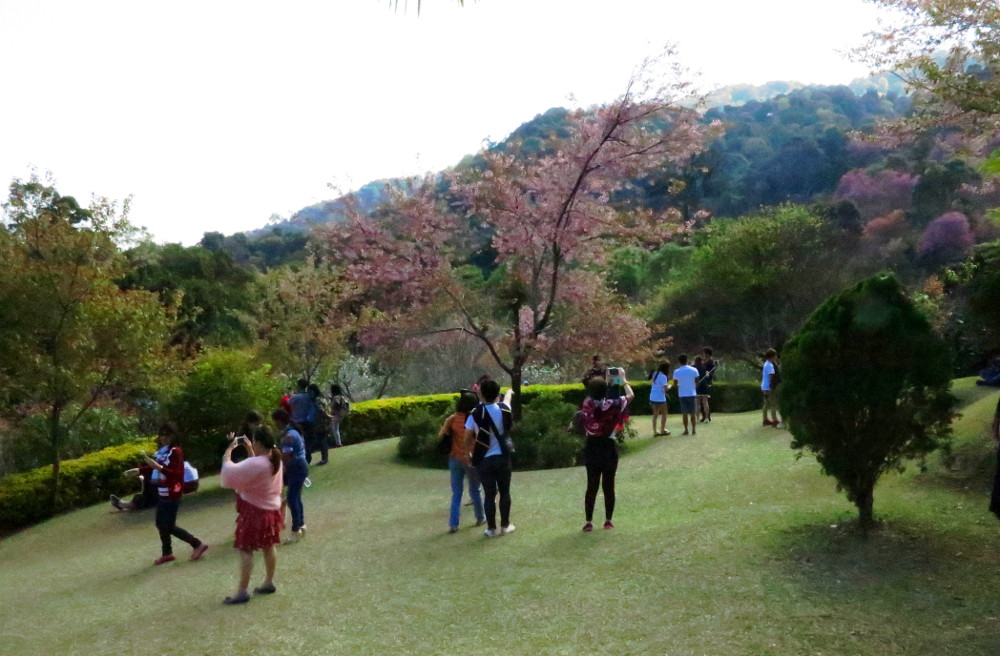 Tuosta Hmong-kylästä voisi ajella eteenpäinkin, itse en tehnyt niin, mutta puolisoni ajoi vuorta mopolla alas Huay Tung Taon vesialtaalle. Tie muuttui mutaiseksi kärrypoluksi, jota on vaikea ajaa. Mutta tuolloin tammikuussa 2015 näytti olleen kirsikka- tai muiden puiden kukkimisaika.