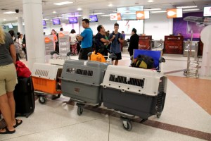 Lentokentälle olin pyytänyt tutun ihmisen auttamaan. Olisin selvinnyt varmasti itsekin, mutta on helpottavaa, että siinä on toinenkin ihminen, kun pitää rullata kopit koirineen terminaalin sisälle, jossa koirat ehkä joutuu ottamaan kopeista ulos mikäli kopit laitetaan läpivalaisulaitteen läpi (tämä vaihtelee paljon). Sitten joutuu vielä jonottamaan check-in -tiskille koirakärryjen kanssa ja punnitsemaan kopit koirineen. Ja sitten vielä piipahtamaan toisaalla olevalle lentoyhtiön tiskille maksamaan koirista painon mukainen hinta (sellainen hinnoittelu on Thaimaan sisäisillä lennoilla) ja palaamaan check-in -tiskille. Mutta ei se mitään vaikeaa ole.