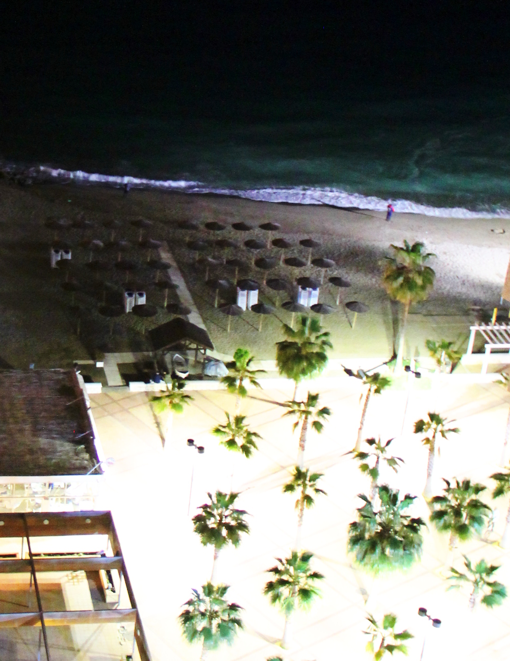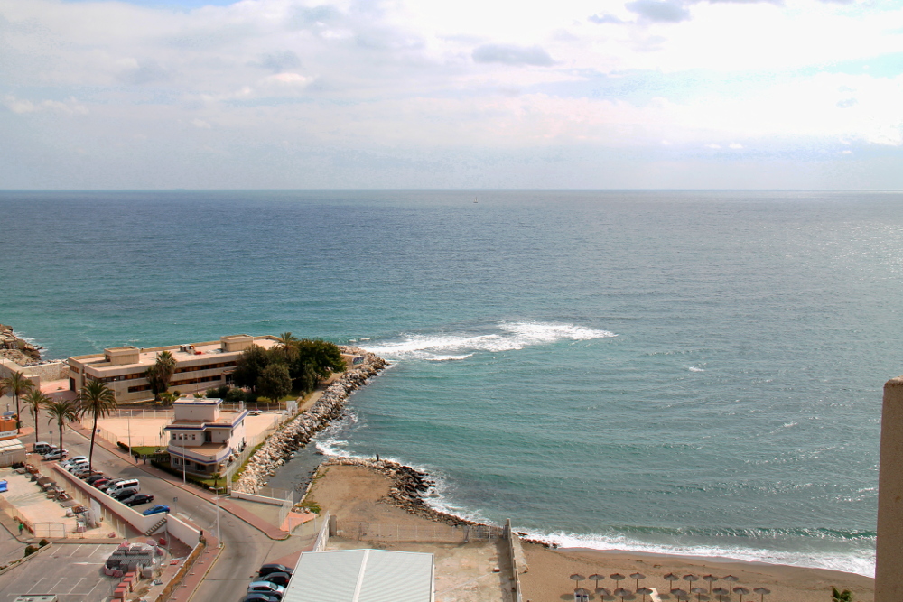 Majoituimme rantatien varrella olevaan hotelli El Puertoon (Pierre & Vacances), huone merinäköalaparvekkeella oli helmikuussa jotain 50 euroa yöltä, mutta nyt pääsiäisen aikoihin hinnat ovat nousseet jo sataan euroon yöltä. Huone oli aika pieni, mutta ei se haitannut, kun oli siistiä. Se on varmaankin Fugen korkein rakennus, me olimme 12. kerroksessa. Kattoterassilla olisi hieno uima-allastasanne, mutta se ei ollut talvella auki.