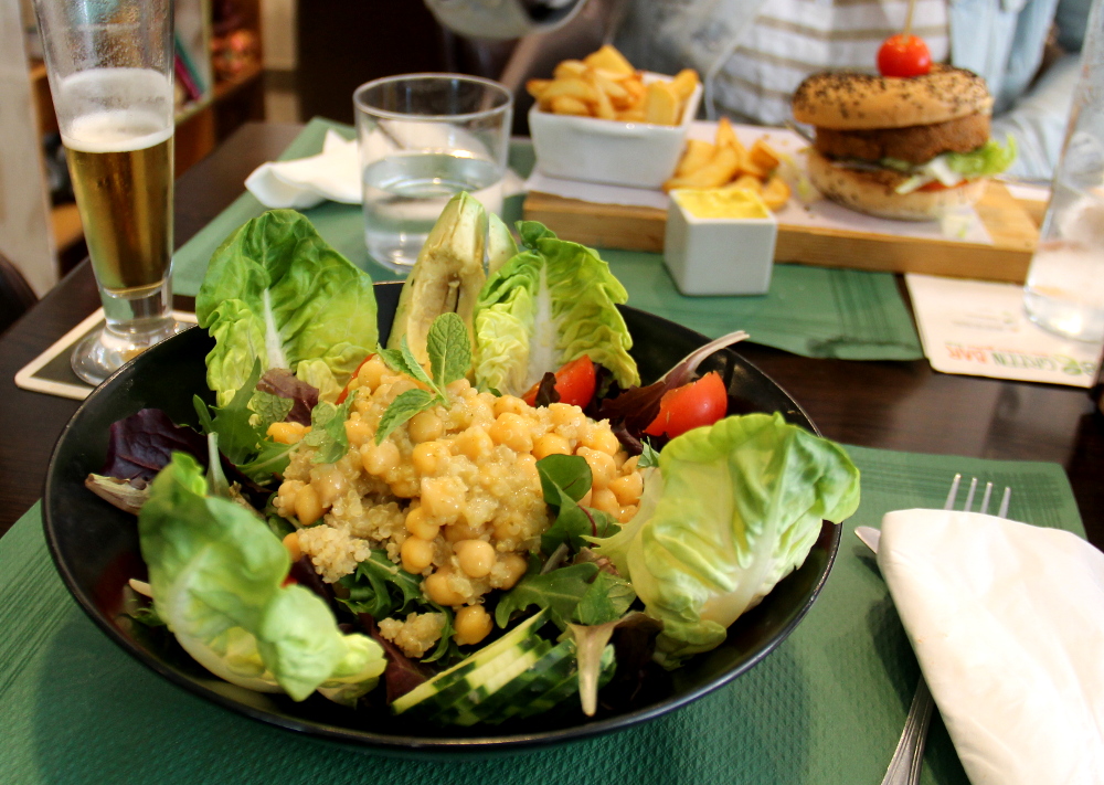 Green Barissa olisi voinut tilata vegaanisena espanjalaista omelettia eli tortillaa, pikkupitsoja, täytettyjä patonkeja ja päivän ruoka-annoksia. Me tilasimme gazpachoa, burgerin ja salaatin.