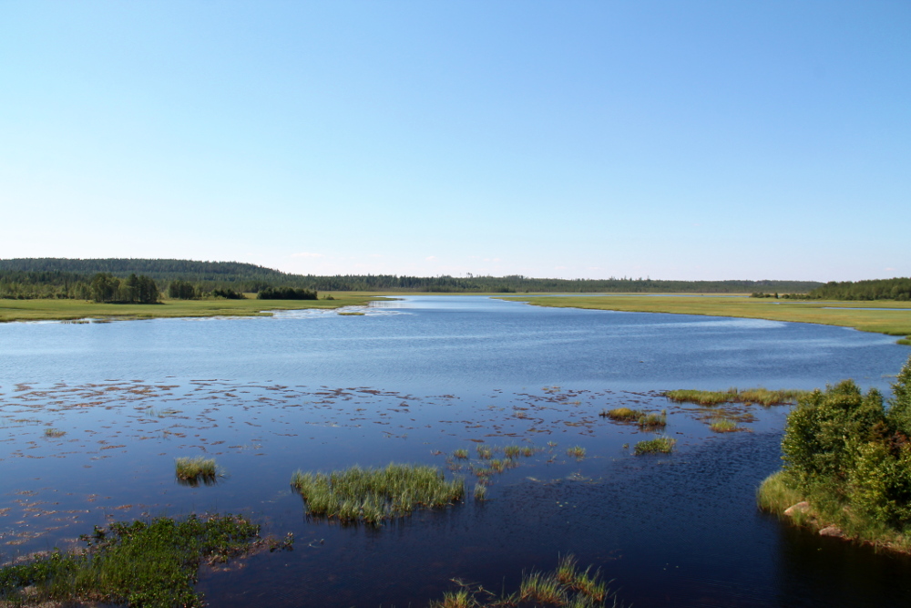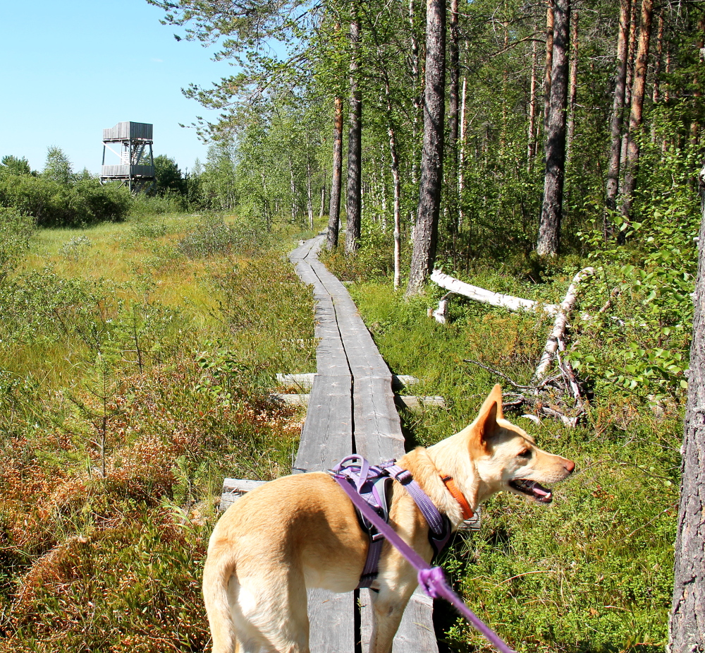 Lisäksi kesällä 2017 pysähdyimme toisella lintutornilla Hossan ja Suomussalmen välisen 843-tien varrella melkein umpeen kasvaneen Hirvasjärven rannalla (osoite Juntusrannantie 308). Siellä oli tieltä ihan lyhyt matka parkkipaikalle, josta lähti pitkospuut lintutornille.