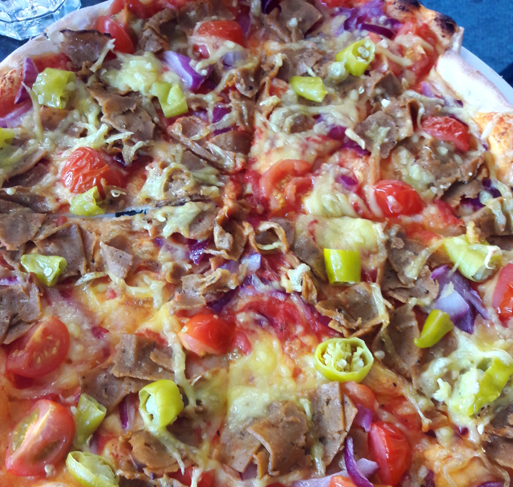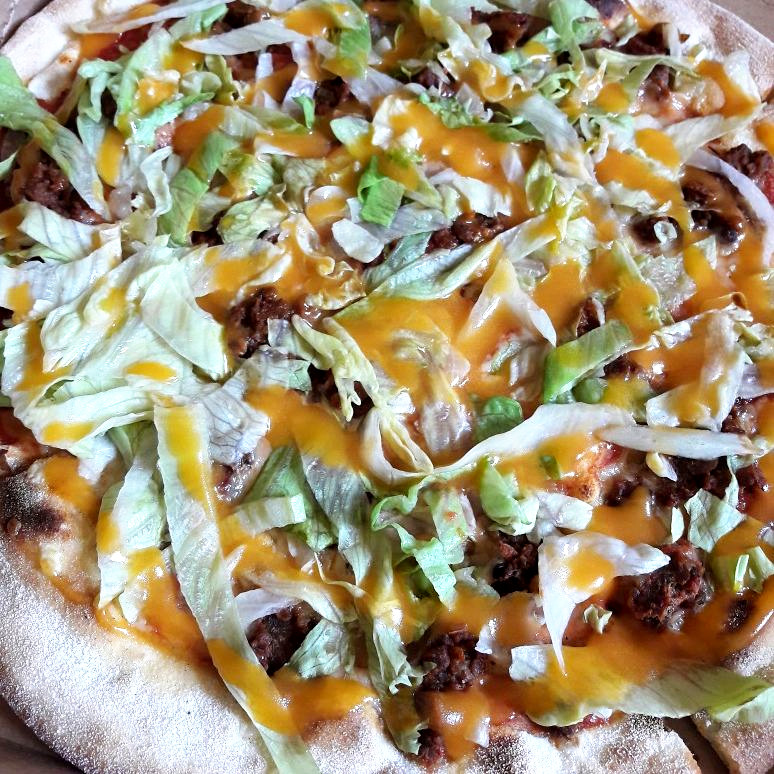 Kuhmon Nesteeltä olemme tilanneet härkisburgerpitsoja vegaanijuustolla. Jatkossa en tilaa tätä pitsaa, vaan sen sijaan tilaan täytteet vapaavalintaisesti ja ilman outoa jäävuorisalaattia.
