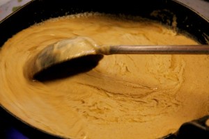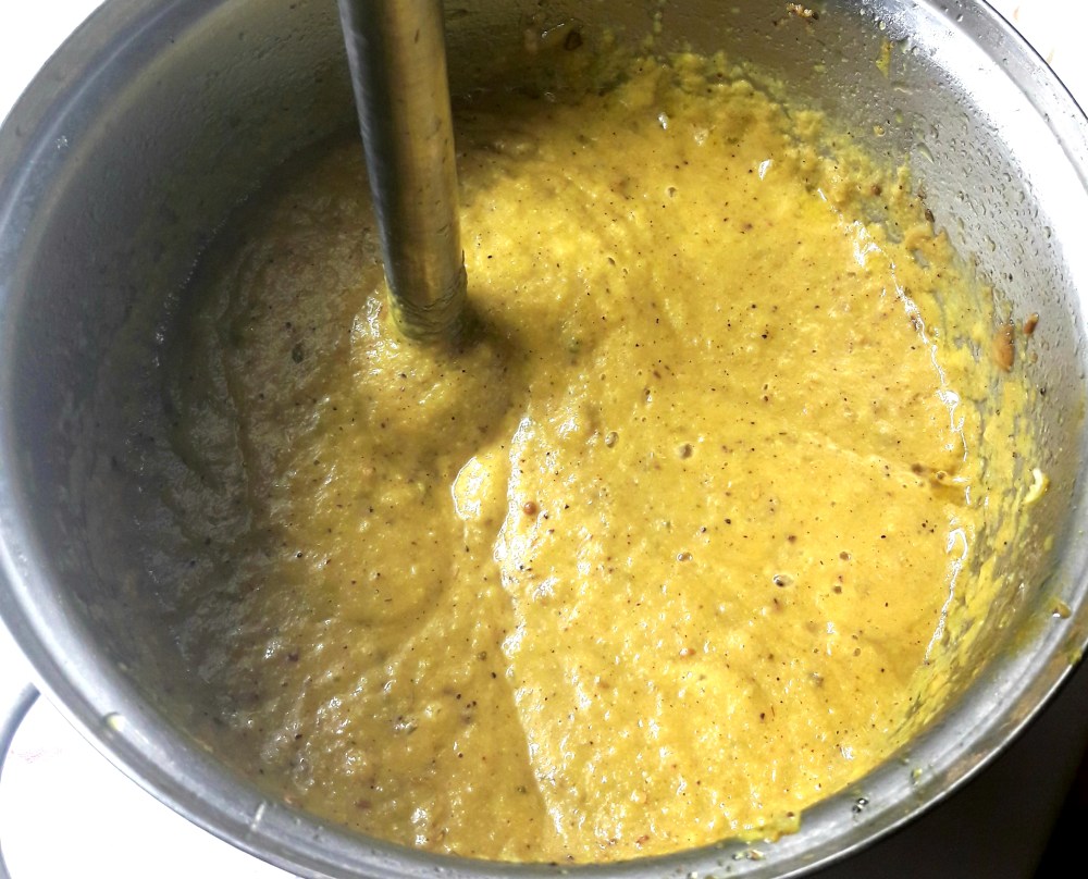 Anna kastikkeen jäähtyä ja poista siivilällä joukosta kokonaiset mausteet. Sekoita kastiketta tehosekoittimessa kunnes se on tasaisen pehmeää eikä sieltä tule mitään sattumisia suutuntumaan. Paista kastike pannulla öljyssä (ei oliiviöljyssä) – tämä tuntui liialliselta ainakin kun lopullista kastiketta paistettiin öljyssä myös.