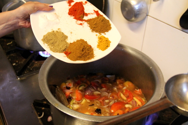 Cashewpähkinät tulee liottaa vedessä yön yli tai vähintään tunnin ajan. Pilko sipulia ja tomaattia. Keitä näitä kaikkia vedessä kaikkien mausteiden kanssa 15 minuuttia. Vettä tulee olla sen verran, että sipulit ja tomaatit peittyvät hiukan, vettä ei siis tule paljoa ja se höyrystyy pois pian.