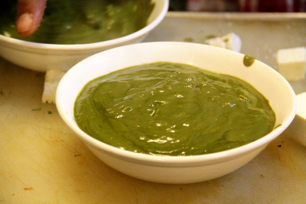 Leikkaa pinaatti pieneksi ja lisää joukkoon pilkottua ja paistettua sipulia, mintun lehtiä, jeeran siemeniä ja tahnaksi murskattua inkivääriä ja valkosipulia. Keitä näitä 7 minuuttia (kurssilla keitettiin paljon pidempään) ja sitten jauha tehosekoittimessa pehmeäksi tahnaksi. Paista tahnaa pannulla ruokaöljyssä 5 minuuttia. Jäähdytä ja säilytä pakastimessa.