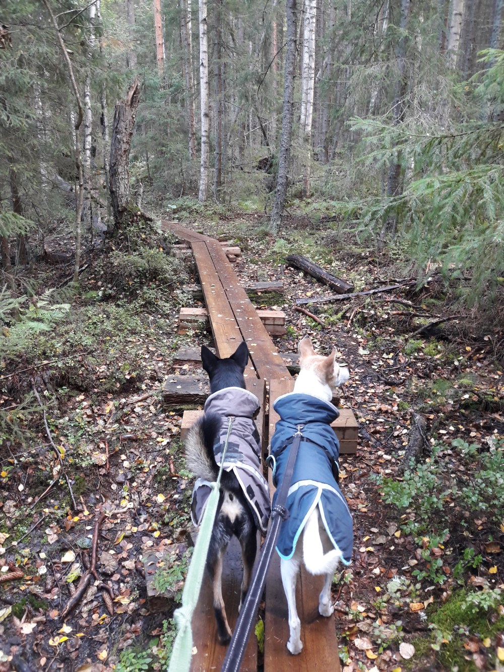 Metsässä liikkuminen on paljon helpompaa, koska koirat etenevät paljon paremmin poluilla kuin kaduilla, joilla ne pysähtelevät enemmän haistelemaan ja joilla joutuu väistelemään muita kulkijoita. Kiinnitin Alman ja Greipin hihnat vyöhöni ja Lexien hihnaa pidin kädessä. Toisella kädellä ohjailin, ettei Alman pitkä hihna sotkeudu muiden ympärille. Greippi käveli suurimmaksi osaksi takanani, se on varmaan oppinut varomaan veturi-Almaa hihnoineen. Pitkospuilla onkin helpompaa, kun Lexie ja Greippi eivät yritä kävellä rinnakkain toinen toistaan pudotellen. Pakettiautossa kaikki matkustavat omissa kopeissaan. Retkipaikoilla ne on helppo ottaa autosta ulos ja sisään, mutta kolmen kanssa se on kaupungissa vaarallista kadun varteen pysäköidessä ja siellä koirien viennit pitää jakaa kahteen erään. Juu, ei ole kaupunki enää minun paikkani asua.