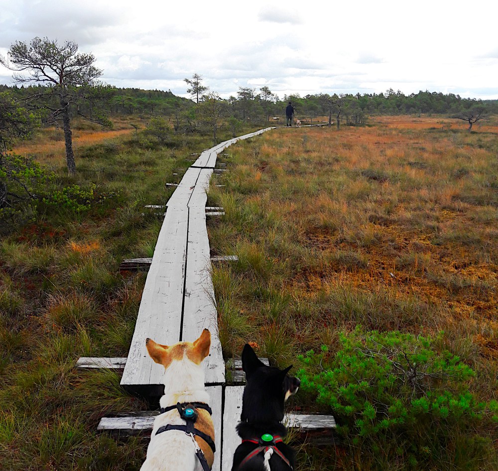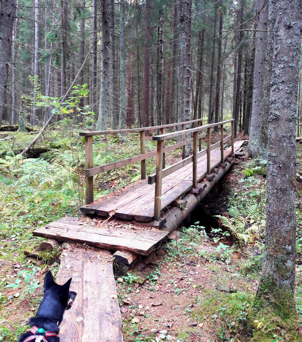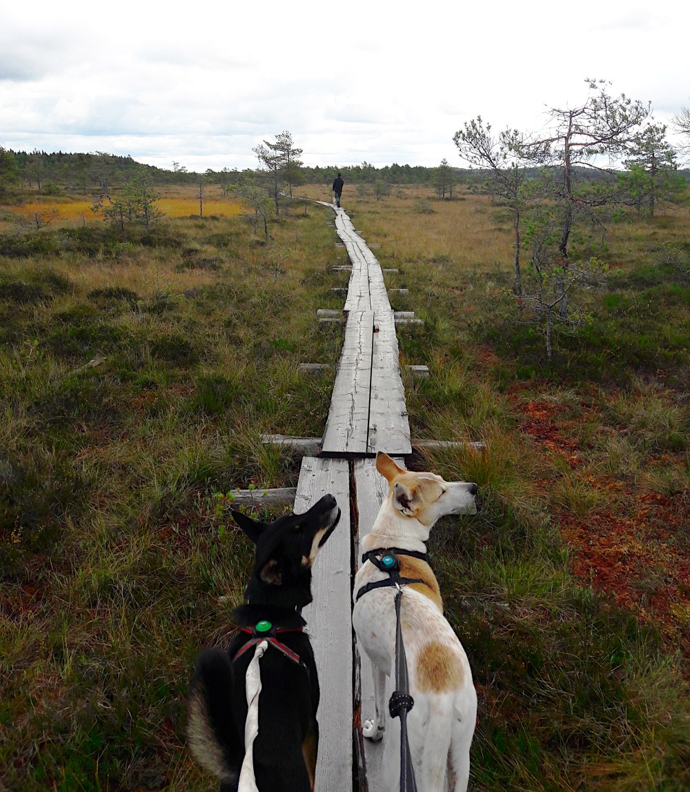 Torronsuon kartat esittelevät vain yhden virallisen rengasreitin, jossa mennään Kiljamon parkkipaikalta suon halki pitkospuita pitkin. Sitten tulee metsäosuutta ja sen jälkeen joudutaankin kävelemään hiekkatietä pitkin. Kannattaa silti pitää silmällä metsässä keltaisella merkittyjä Ilvesreitin polkuja, jotka kulkevat tuon hiekkatien lähellä. Niitä metsäpolkuja on paljon hauskempi kävellä. Tien varrella on ihan nätti Torron kylä. Lopuksi joudutaan kävelemään maantietä pitkin parin kilometrin verran ja se oli ikävää. Siinä koirien säikkyessä mietitytti, että eikö maanomistajilta ole saatu lupaa tehdä metsään polkua. Me kävelimme sitten ojassa ja lopulta menimme rämpimään metsään. Ihan lopuksi lähtee maantieltä kansallispuiston polku kohti suota. Voisi olla ihan syytä hiekkatielle tullessa kääntyä takaisin ja palata Kiljamoon samaa reittiä.