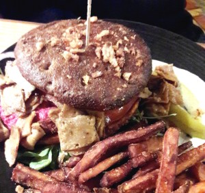 Telliskiven alue on tosi kiva ja F-hoone voi olla ravintola, joka kannattaa sisällyttää ohjelmaan siellä käydessä. Se on semmoinen vanhassa teollisuusrakennuksessa sijaitseva mukavanoloinen paikka, josta tulee mieleen ehkä lähinnä Onda-Siltanen. Menussa on joitain vegaaniruokia, jotka löytyvät ensimmäisen sivun menun ruokien joukosta sekä lisäksi omalta sivultaan yhteen koottuna kasvisruokalistana.