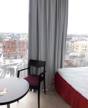 Hotellimme Park Inn by Radisson Meriton Conference & Spa Hotel Tallinn oli hienompi kuin mihin olemme tottuneet ja valitsimme sen hyvältä näyttävän kylpyläosaston takia. Siellä oli neljä erilaista saunaa, pari eri lämpöistä poreammetta ja tavallisessa uima-altaassa oli pari pistettä, joissa sai vesihierontaa hartioille tai alaselkään. Satamasta katsottuna hotelli sijaitsi vanhan kaupungin toisella puolella. Siitä oli lyhyt kävelymatka kiinnostavalle Telliskiven alueelle.