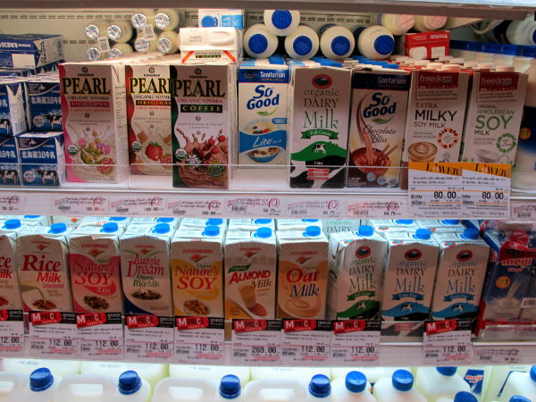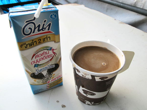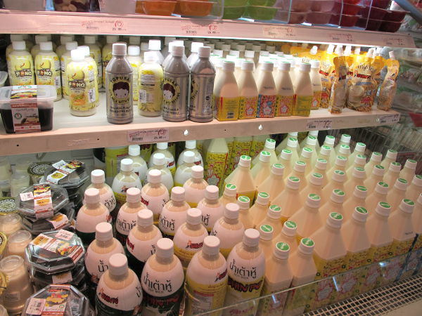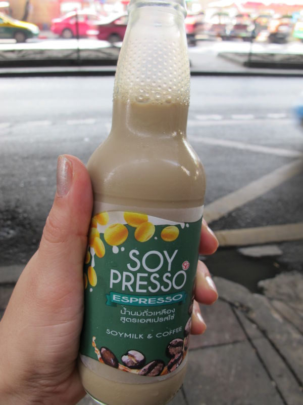 Soijamaitoja pulloissa supermarketissa.Vähäsokerisin löytämäni soijamaitolaatu, jota olen laittanut kadulta ostamaani kahviin. Ravintoloissakin kaivan purkin laukustani ja lorotan soijamaitoa pillin avulla kuppiin.Tämä ei kuulunut suosikkeihini, koska oli aivan liian makeaa. Thaimaassa makea voi olla ihan sairaan makeaa.Tosi makea soijamaito.Soijamaito, jossa myös riisiä.Soijamaitoa basilikan siemenin, jotka käyttäytyvät chian siementen tavoin.Kasvimaitoja ja lehmän maitoja sikin sokin thaimaalaisen marketin hyllyllä.