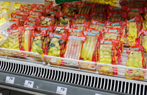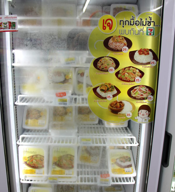 Ostoksia 7-Elevenistä Koh Lantalla asuessani. On suklaasoijamaitoa, kaljaa, colaa ja sipsejä. Tuo mustassa pakkauksessa oleva seesami-soijamaito on niin makeaa, että sitä en sietänyt lopulta enää käyttää. Friteeratut norilevät maistuivat välillä, tosin koin niistä yliannoksen. Vuosia sitten myytiin myös friteerattuja norileviä, joissa oli päällä ohut seesamileivitys, mutta niitä ei ole enää kaupoissa näkynyt. Sitten on edamame-soijapapuja, joita myydään 7-Eleveneissä pakasteena. Ne ovat harvoja melkein tuoreita tuotteita, joita 7-Elevenien valikoimissa on.Norileväsipsit ovat kiva snäksi perunalastujen sijaan. 7/11-kioskeissa myydään näitä joissa on jay/dzee-merkki (ks. kelta-punainen merkki oikeassa yläkulmassa). Monissa merileväsipseissä on kalaa, joten nämä ovat siksi parhaita. Mutta näitä seesamilla leivitettyjä ei ole enää näkynyt 7-Eleveneissä.Kioskien pakastekaapista löytyy usein myös edamame-soijapapuja. Olen syönyt näitä kumoamalla päälle kiehuvaa vettä ja joskus olen tainnut ihan vain antaa sulaa ja syönyt keittämättäkin.Yleensä Thaimaan pullissa on sekä kananmunaa että maitojauhetta. Kasvisfestareiden jälkeenkin löysin tällaisia höttöisiä pullia kioskista. Toisten sisällä oli ihanaa vihreää kookosmössöä ja toisessa makeaa adukipapumössöä. Luulen että nämä täsmälleen samat ovat vegaanisia ympäri vuoden.