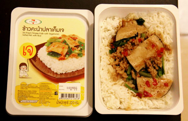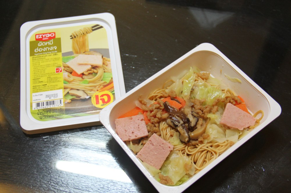 Krabin alueella, mm. Koh Lantalla, voi 7-Eleveneistä löytää näitä banaanimuffinsseja.Kasvisfestareiden aikaan voi kioskeista löytää tavallista isomman valikoiman vegaanisia pakasteannoksia.7 -Elevenin kasvispakasteiden pakkausten ulkoasu vaikuttaa vaihtuvan joka vuosi, joten ne tuskin ovat samannäköisiä tällä hetkellä kuin tämä.Ostin Thaimaassa yleensä kuivahedelmiä makeannälkääni. Nehän eivät ole pelkästään kuivattuja hedelmiä, vaan myös sokerissa ja ehkä myös rasvassa kyllästettyjä.Pähkinöitä tuli ostettua 7-Eleveneistä ja muista kaupoista.Kasvisfestivaalien aikaan 7-Eleveneistä löytyi myös ”lisää vain vesi” -nuudelikippoja ja -keittoja. Lisäksi joskus on tällaisia vakuumipussissa olevia currykastikkeita.Thaimaassa paahtoleipä ei yleensä ole vegaanista, koska mukana on vähintäänkin maitojauhetta. Kasvisfestareiden aikaan myytiin vegaaniversiota (huomaan kelta-punainen ”L7”-merkki), mutta yleensä tässä samannäköisessä pussissa olevat paahtoleivät eivät siis ole vegaanisia.Vegaanileivos- ja pasteijavalikoimaa ylimmällä hyllyllä kasvisfestareiden aikaan.Näitä CP-foodsin kasvismakkaroita löysin 7-Elevenistä vain kasvisfestareiden aikaan.7-Elevenin kasvispakaste.Riisiä ja kalamaista kasvisruokaa. Tätä en ole nähnyt myynnissä kuin kasvisfestivaalien aikaan.