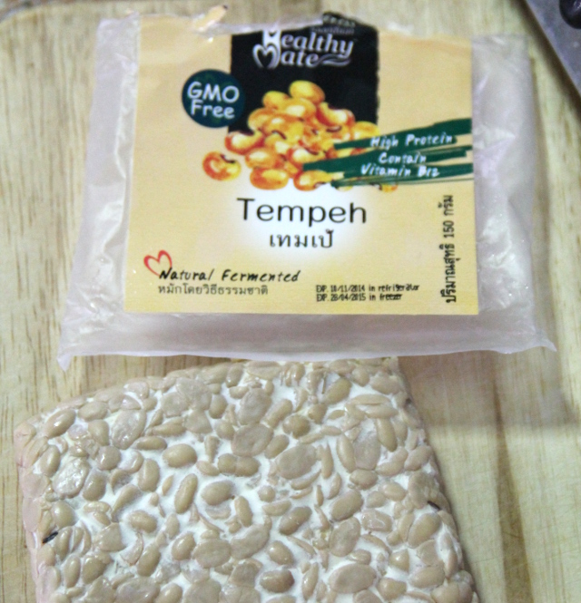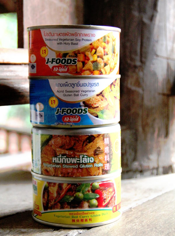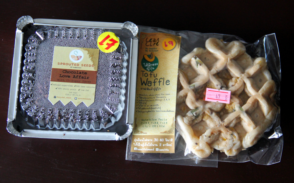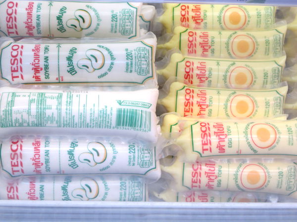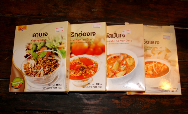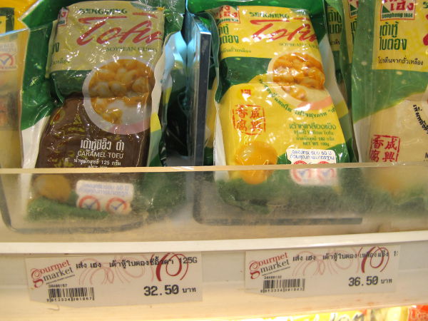 Alle euron hintaisia tofupakkauksia.Erilaisia tofuja Bangkokin Siam Paragon -ostoskeskuksessa.Tämmöisinä pötkylöinä voi ostaa pehmeää silkentofua. Pitää vaan olla tarkkana, kellertävissä tällaisissä on ”eggtofua”. Nämä maksavat yleensä vain jotain 25 eurosenttiä.Tempeä löysin yhden kerran Rimping-supermarketista Chiang Maista. Thaimaa ei ole Indonesian tapaan tempemaa.Toreilta ja kaupoista voi ostaa tuoreita riisinuudeleita. Ne ovat pehmeämpiä ja silkkisempiä kuin kuivatuista nuudeleista tehtyjen keittojen nuudelit.Jos asustelee Thaimaassa jossain, missä tuotevalikoima on suppea, voi tämä vegaaninen creamer-tiiviste tulla tarpeeseen, jos haluaa kehitellä vaikka jotain jälkiruokia. Olen testannut tätä kahvissakin, mutta en oikein tykännyt.Kannattaa pitää silmät auki, koska Thaimaan kasvisravintoloissa ja terveysruokakaupoissa myydään milloin mitäkin vegaaniherkkuja.Tällaisina säilykkeinä voi löytää erilaisia soija- ja seitanlihoja maustekastikkeissa. Näitä on supermarketeissa ja usein myös halvat kasvisravintolat myyvät näitä.Söimme kolean kansallispuistopäivän päätteeksi kuppinuudeleita, purkkipapuja, sipsejä ja 7-Elevenin pullaa.Maman kasvisnuudelikuppeja löytyy joskus supermarketeista.Löysin tällaisia valmisruokia ja -kastikkeita ostoskeskuksesta. Pakkausten sisällä on vakuumipussit valmista tofuruokaa.Ostin kerran uteliaisuudestani tällaista kuivattua raastettua vegelihaa, koska lihaversioina näitä näkyy paljon.