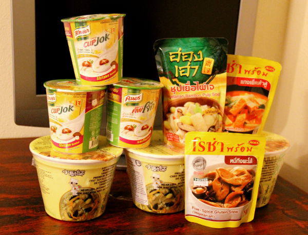 Sitten on kaikenlaiset Thaimaan valmistuotteet, joita esittelen kuvin alempana. Syksyllä 2015 minulla oli sellainen parin kuukauden pätkä Chiang Main maaseudulla, ettei minulla ollut käytössäni keittiötä enkä vielä osannut ajaa mopoa, jolla olisin päässyt ostamaan säkkikaupalla hedelmiä tai jolla olisin päässyt kunnon ravintoloihin. Siispä elin pari kuukautta hyvin pitkälle einesruoalla.