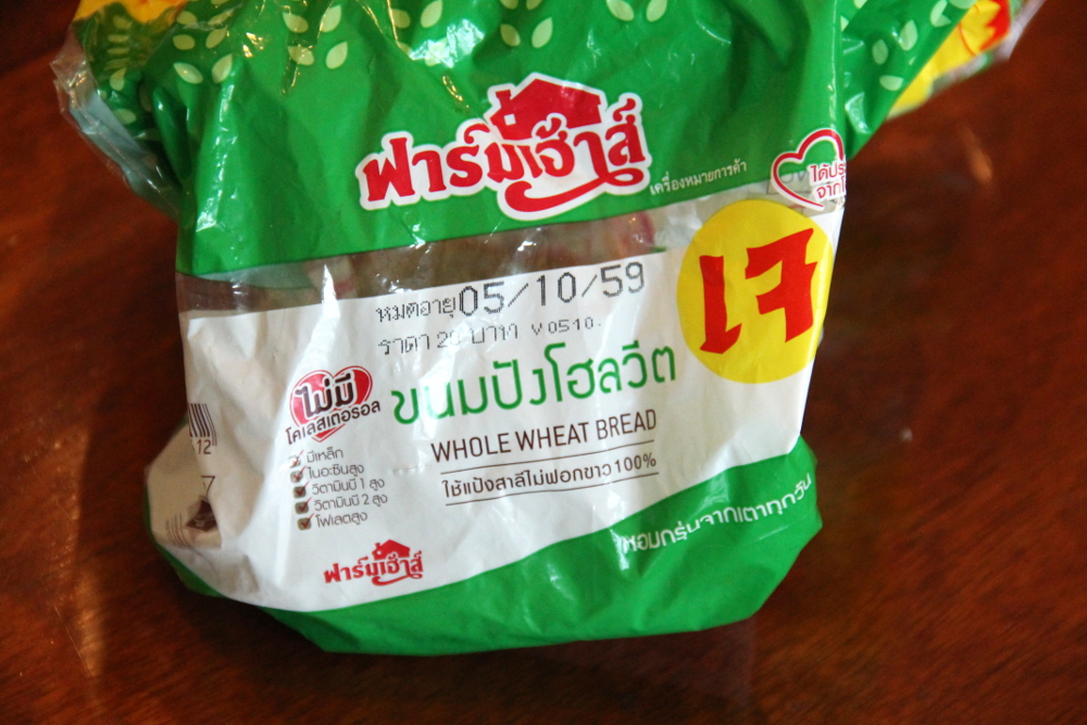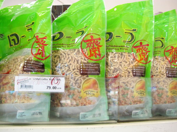 Ostoksiani Chiang Maissa paikallisesta vähän paremmasta supermarket Rimpingistä joulun 2016 aikaan. On vihanneksia ja hedelmiä, soijajugurttia, Healthy Boyn sieni-stir fry -kastiketta, Pregon hyvää pastakastiketta, suklaakasvimaitoa, erilaisia tofuja ja vegaaninakkeja sekä sieniä.Kahden euron nakki- ja muita kasvisruokapakkauksia supermarketissa. On merilevämäistä kalamaista hommaa ja muunlaisia paloja. Huomaa että siinä missä Suomessa vegetuotteet pakataan usein raikkaan vihreäsävyisiin pakkauksiin, niin Thaimaassa käytössä on keltainen ja punainen väri.Tässä erilaisia kasvislihoja vihreäsävyisissä pakkauksissa, mutta niissäkin on kelta-punaiset merkit.Ainakin pari vuotta sitten Thaimaan 7-Eleveneistä ja muista kaipoista löytyi tällaisia soijajugurtteja. Tätä luumumakua löytyi harvemmin, useammin taas mustikka- ja mansikkamakuja.Nämä suklaalla kuorrutetut kookoslastut ovat mahtavia. Thaimaassa kun on kuuma, niin näitä ei kannata säilyttää pitkään lämpimässä ja avattu pakkaus pitää laittaa ehdottomasti jääkaappiin ellei sitten vedä kaikkea kerralla. Silloinkaan ei pidä hypistellä lastuja liian kauaa, kun suklaa sulaa sormiin.Näitä soijaproteiinipaloja ostin supermarketista, mutta joskus joitain tällaisia löytyy myyjien itse pussittamina toreiltakin.