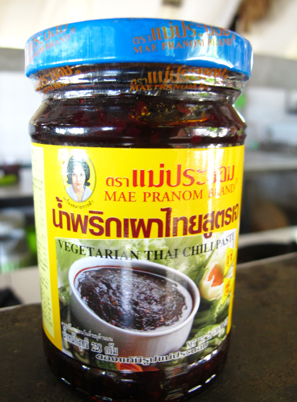 Kuvassa isompi pullo on maailman parasta soijakastiketta, Healthy Boy eli Dek Som Boonin / Deg Somboonin sienisoijakastiketta. Pienempi pullo on paahdettua seesamiöljyä, jota tarvitsee vain ihan vähän laittaa ruokiin maustaakseen ne ihanasti. Vaalean väriset seesamiöljyt eivät ole paahdettuja eikä niissä ole samaa hienoa makua. Edessä tärkeitä aineksia thaimaustamiseen: sitruunaruohoa, kaffirlimen lehtiä, valkosipulia, inkivääriä ja limettiä.Soijapapukastike on tällaisessa pullossa kun ostaa Healthy Boy eli Deg Somboon -merkkiä.Lisää Healthy Boyn tuotteita, näitä ei ole tainnut edes maistaa, mutta niillä todennäköisesti saa ruokiin helposti halutut aasialaiset maut.Sekä Thaimaan currytahnoissa että chilitahnoissa on useimmiten kalakastiketta tai katkaraputahnaa. Mae Pranom -merkillä on erikseen olemassa vegetarian chili paste. Tätä olen Suomessa nähnyt myynnissä ainakin Helsingin Kolmannen linjan aasialaiskaupassa.