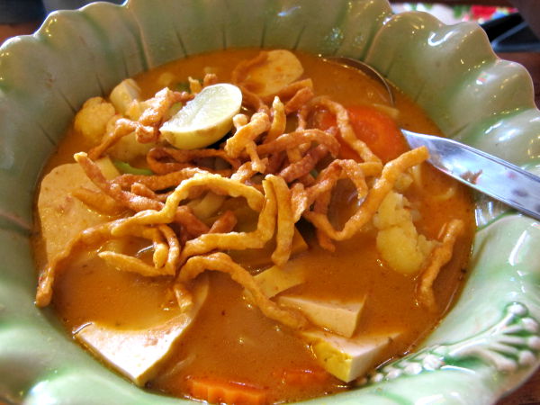 Khao Soi vähän niin kuin pohjoisen Thaimaan kansallisruoka. Yksinkertaisesti selitettynä se on nuudeleita sekoitettuna currykastikkeeseen. Paitsi että currykastikkeet harvoin ovat katukeittiöissä ja tavallisissa thairavintoloissa vegaanisia, niin khao soin nuudelit ovat kaiken lisäksi yleensä munanuudeleita. Siispä khao soita kannattaa tilata vain kasvisravintoloissa ja niissäkin kannattaa tähdentää, että ei munanuudeleita. Tätä todellakin kannattaa tilata, koska khao soi on yleensä todella messevää.
