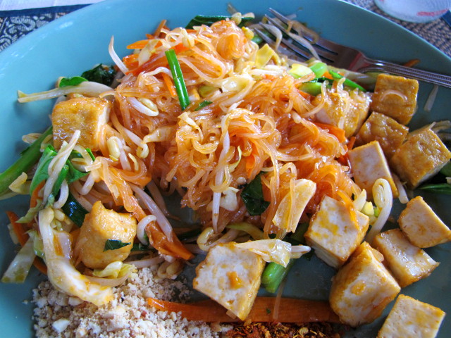 Pad thai pitää pyytää kasviksena tofulla (pad thai pak tofu), koska muuten siinä usein on kanaa (gai) tai katkarapuja. Erityisen tärkeää on sitten myös muistaa pyytää se ilman kananmunaa, jota siihen muutoin tulee aina, ja ilman kalakastiketta (nam plaa). Minulla on vaikeuksia yrittää thaiksi tilata ilman kanaa ja kananmunaa, koska nämä ovat niin samanlaiset sanat enkä nyt muutenkaan osaa thaita.