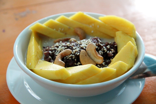 Thaimaalainen jälkiruoka mango sticky rice (khao niau mamuang) on makea tapa aloittaa päivä. Jos ei ole Thaimaan mangoaika (yleensä huhti-toukokuu), eivät mangot ole kaikkein makeimpia, mutta usein tätä on saatavilla vuoden ympäri.