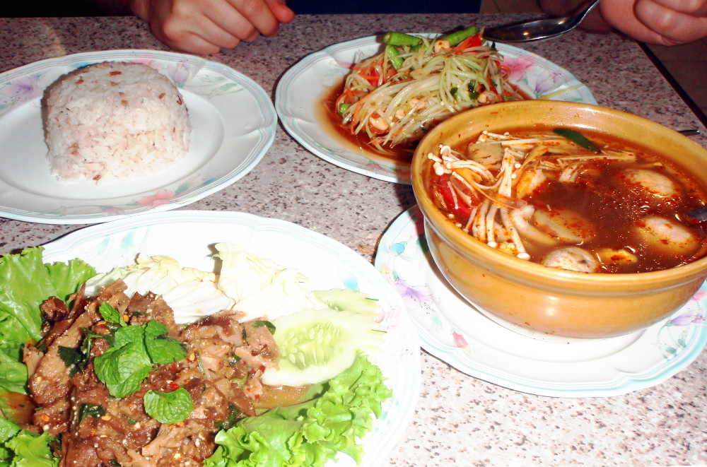 Som tam on papaijasalaatti, jota tehdään raa´asta papaijasta, jonka hedelmäliha on valkoista. Yleensähän suomalaisille tutumpaa on syödä papaijat kypsinä, makeina ja oranssilihaisina. Lisäksi papaijasalaatissa on yleensä porkkanaa, tomaattia ja maapähkinöitä ja ehkä myös pitkäpapua. Salaatin pääjuttu on kuitenkin mausteliemi, johon tulee palmusokeria, valkosipulia, limemehua ja aivan liikaa chiliä. Olen monta kertaa joutunut jättämään som tam -annokseni kesken, koska se on liian tulista. Chilin määrä on harmitus, koska papaijasalaatti on tajuttoman hyvää.