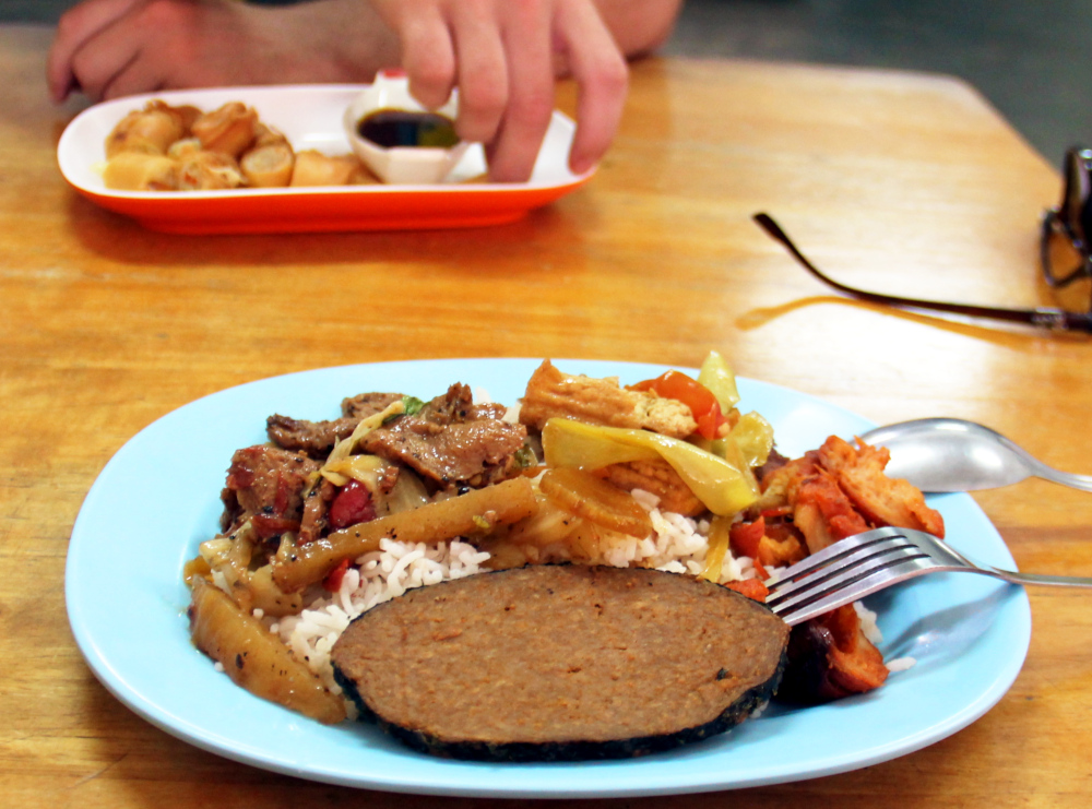 Kävin sekä Bangkokin Khao Sanin lähimmässä thaimaalais-kiinalaisessa kasvisravintolassa että vastaavassa paikassa Krabi Townissa. Tällaisissa ravintoloissa arvon sen välillä tilaanko nuudelikeiton vai valitsenko vitriinistä erilaisia kastikkeita ja paistoksia riisin oheen. Lisäksi haluan usein maistaa maailman parhaita kasvisnakkeja tai muita feikkilihoja.