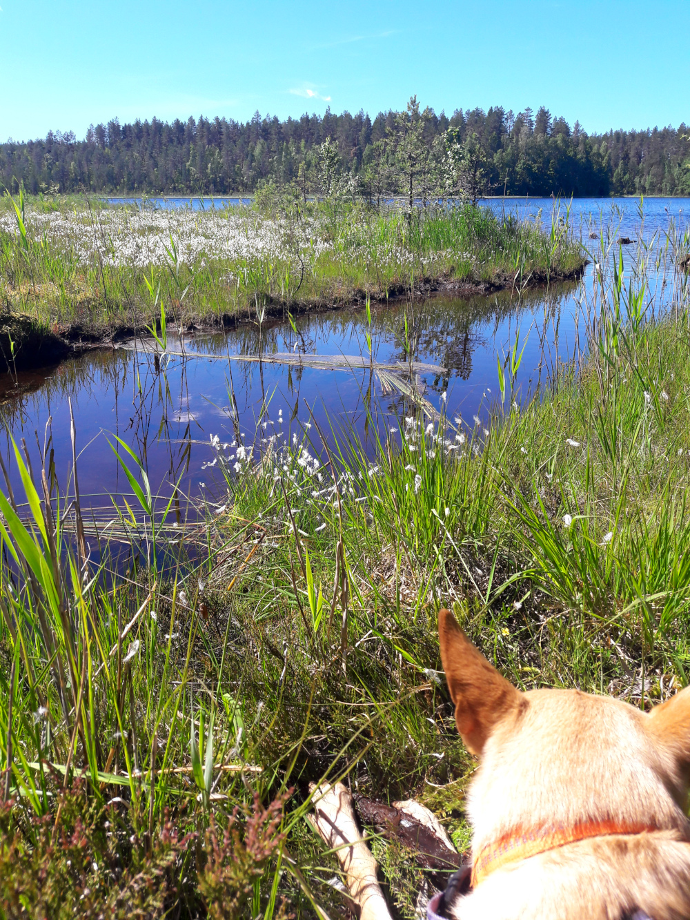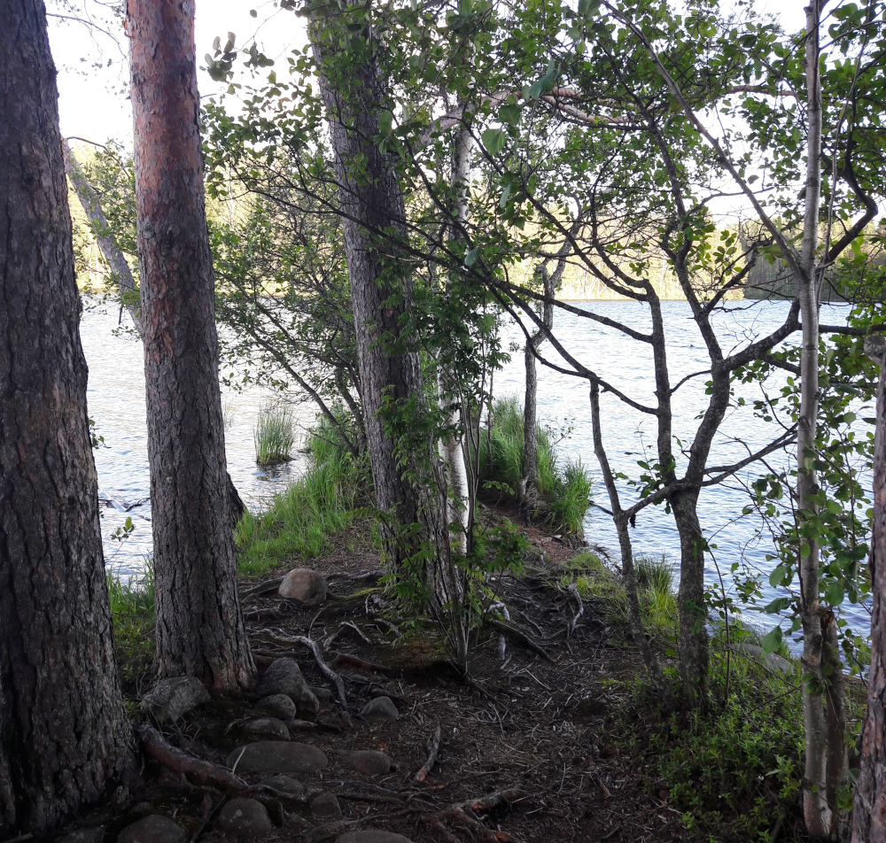 Luupään lenkin ja Kirveslammen kierroksen jälkeen otin koirien kanssa autossa pitkät päikkärit ja illaksi ajoimme Selänpohjalle. Siellä kävelimme 4,5 km Harjukierroksen ja kävimme Joutsniemellä. Joutsniemen päähänhän on ehdotonta kävellä. Se on semmoinen ehkä 1,5 km pitkä liuru niemeksi ja kovin korkea. Tämmöisiä samoja kapeita ja hyvin pitkiä harjuniemiä olen kävellyt myös Tiilikkajärven ja Liesjärven kansallispuistoissa, mutta tämä taisi olla korkein. Liesjärvellä niemi ei ole korkea ollenkaan eikä semmoinen samanlainen harju, mutta siellä tuo niemi on oikeastaan koko järven läpi menevä kannas. Tiilikkajärvellä oli parikin samanlaista niemeä kuin Joutsniemi.