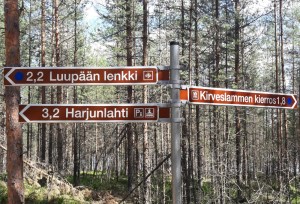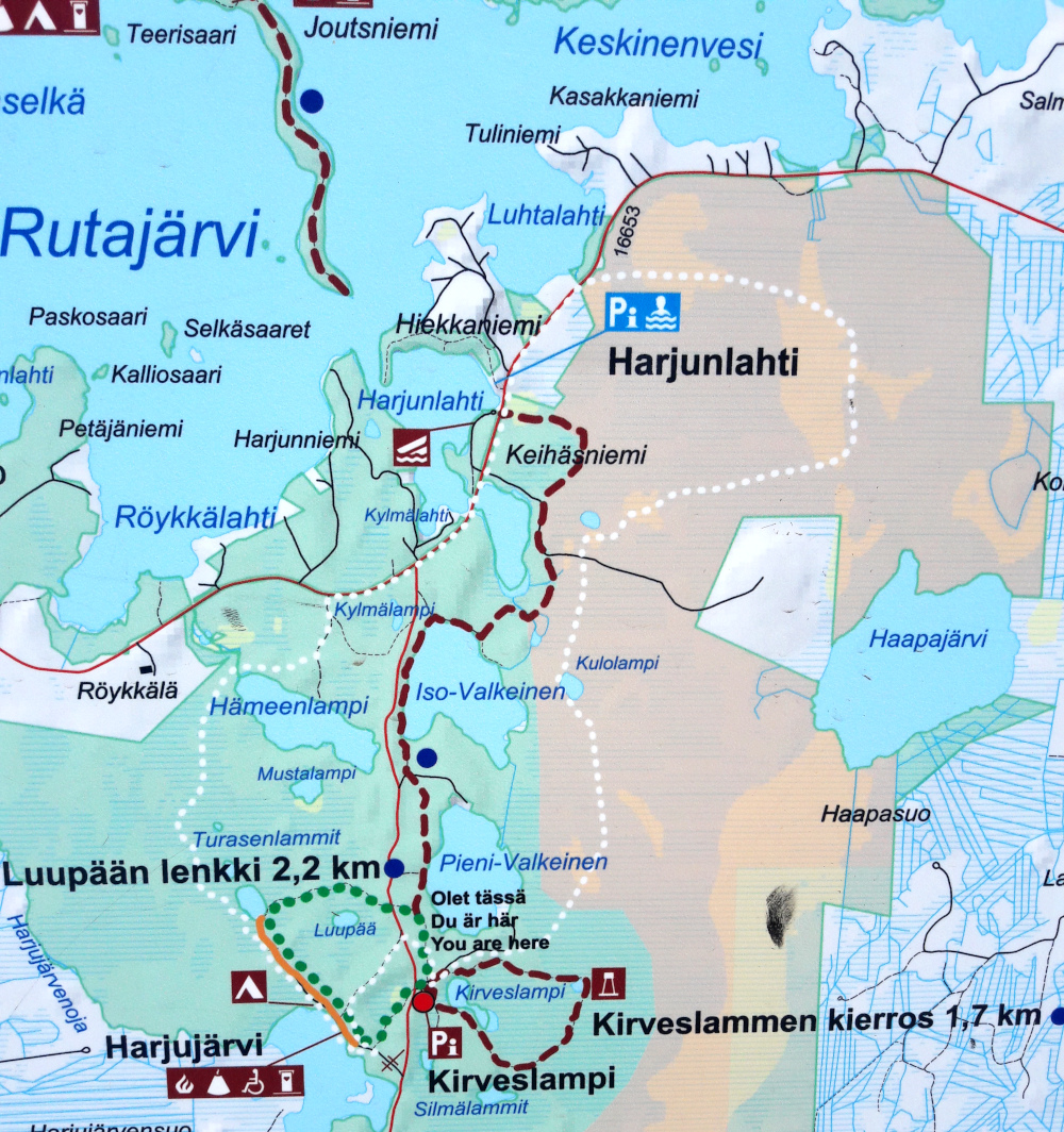 Kansallispuiston sisällä Kirveslammen pysäköintipaikka ei ole kovin kiva matkailuautoilijoille, koska sinne menee kuhmurainen pikkutie. Voi siis tehdä kuten minä ja parkkeerata Harjulahteen ja kävellä sieltä 3 km metsäpolkua pitkin päästäkseen 2,2 km Luupään lenkille ja 1,7 km Kirveslammen kierrokselle.