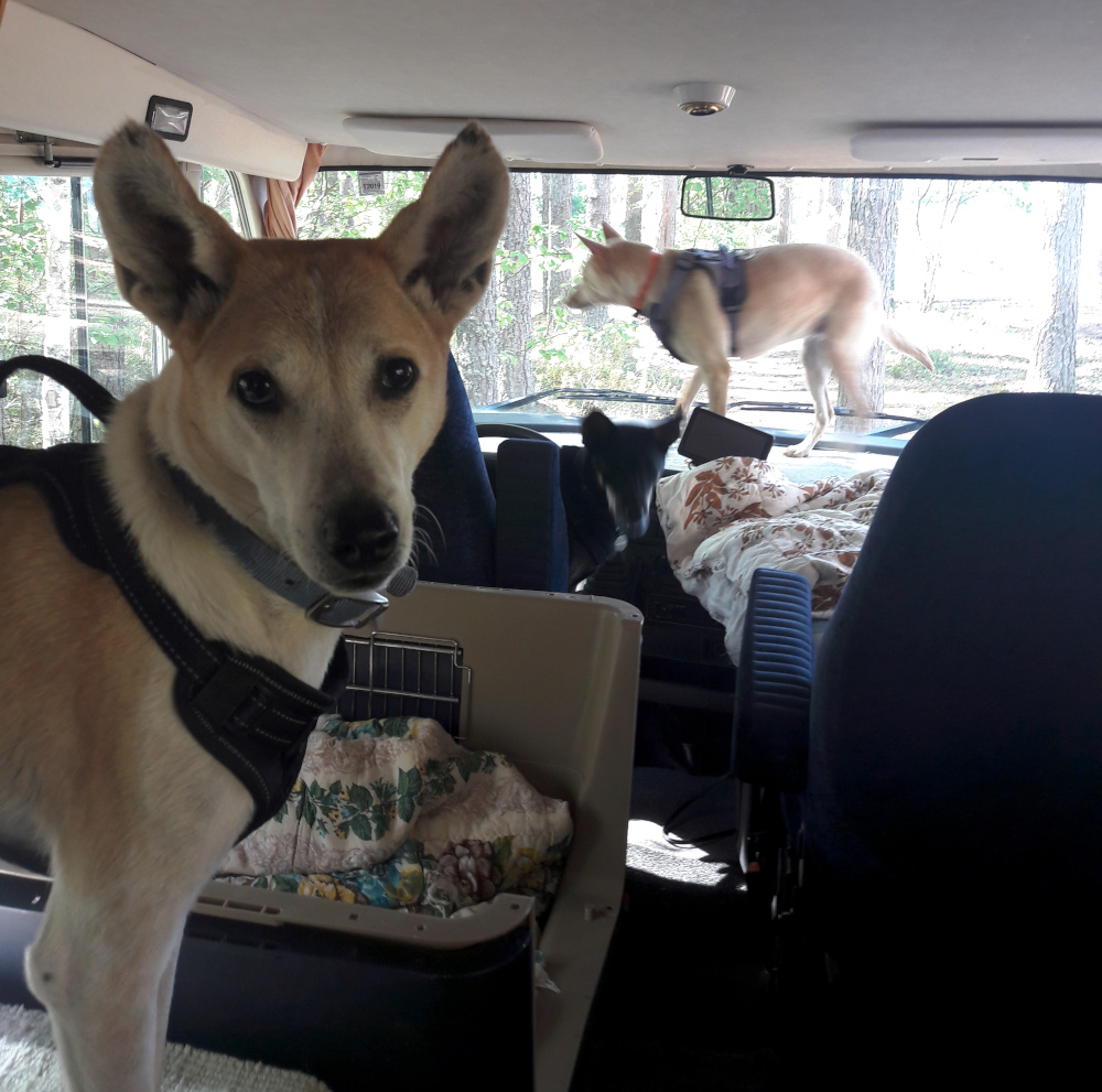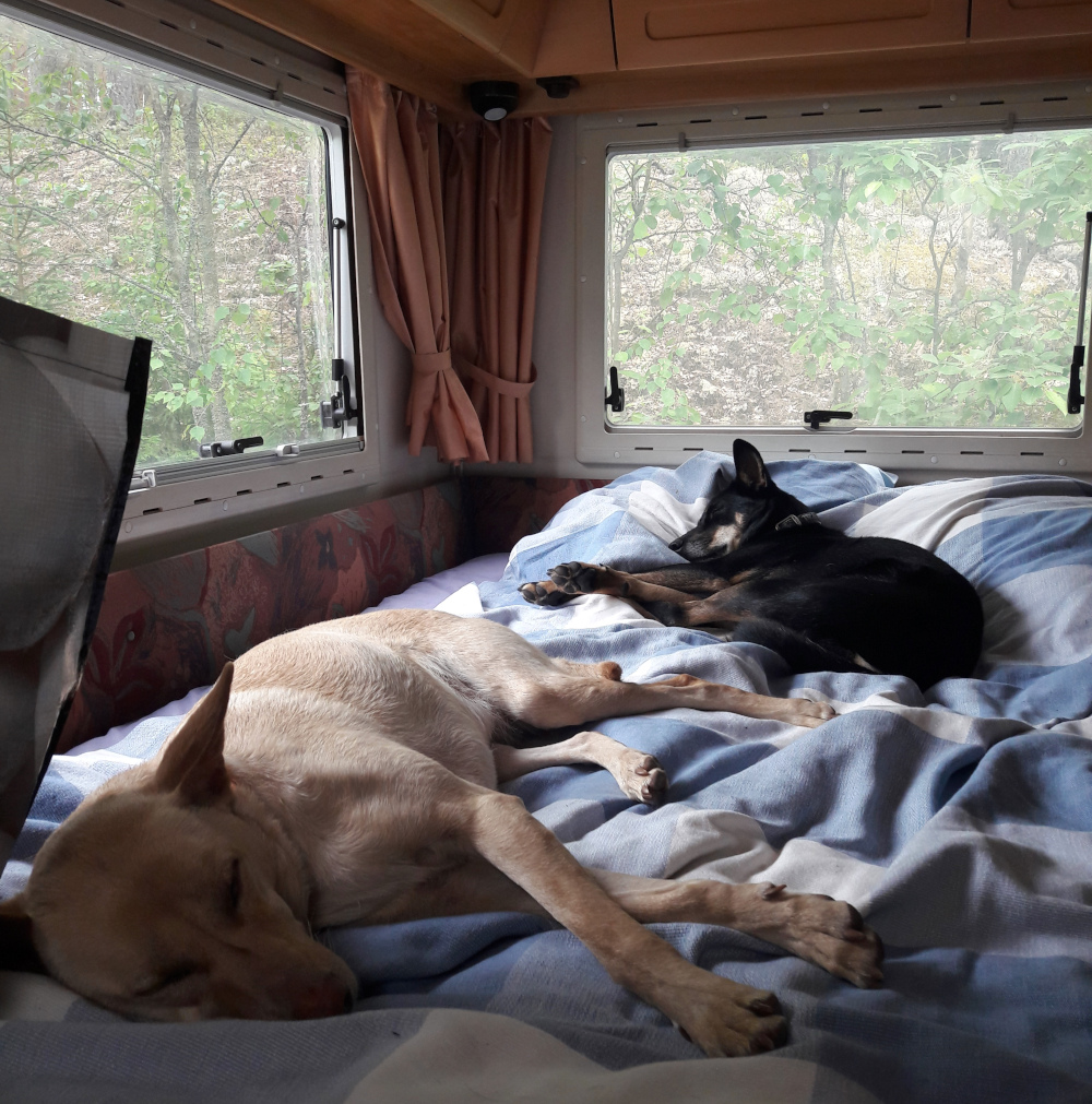 Oli myös semmoinen kuvio, että puolisoni oli päästävä kahdeksi illaksi Tuskaan, joten matkailuautoreissun piti kohdistua jonnekin, mistä hän pääsi kahdeksi yöksi kätevästi julkisilla kulkuneuvoilla piipahtamaan Helsinkiin. Leivonmäestä pääsi. Minä pärjäsin nämä kaksi päivää oikein hyvin yksin koirien kanssa patikoiden, vaikka matkailuauton kanssa liikkumista jännitinkin, mutta ihan turhaan. Huomasin että pystyisin koirien kanssa matkailemaan tuolla autolla ihan hyvin itseksenikin rauhallisilla seuduilla. Jälleen yksi esimerkki yksin matkustamisen voimauttavuudesta. Hassua kyllä, autoilu kotimaassa aiheuttaa minulle paljon enemmän harmaita hiuksia kuin yksin matkustaminen julkisilla missä vain maailman ääressä. Ja koirien kanssa on vastuussa muustakin kuin itsestään.