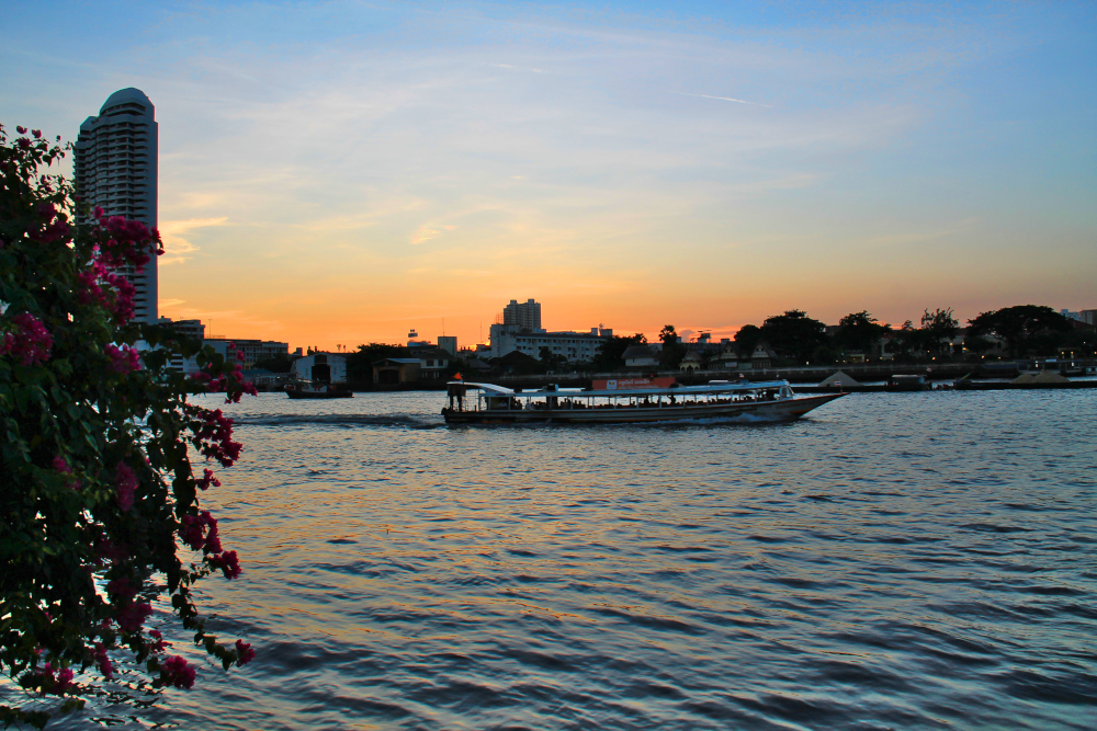 Auringonlasku Chao Phraya -joella Bangkokissa.