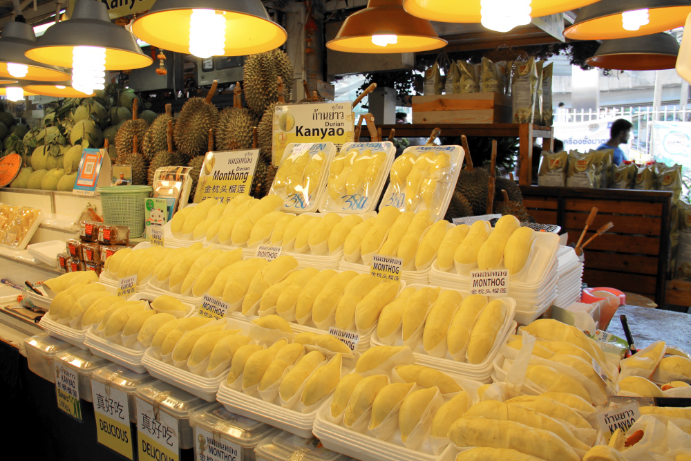 Or Tor Kor on tuoretori Chatuchakin alueen vieressä, Kamphaeng Phet -metroasemalta sinne on opasteitakin (Marketing Organization for Farmers). Sinne voi mennä ihmettelemään thaimaalaisia vihanneksia ja ostelemaan hedelmiäkin hotellishuoneessa tai paikan päällä nautittavaksi. Huom! duriania ei pidä viedä mukaan hotelliin, koska se haisee niin voimakkaasti. Joissain hotelleissa on kiellettyä tuoda myös mangosteeneja, koska niiden kuoret värjäävät voimaakkaasti violetiksi. Minä itse asiassa ostin mangosteeneja mukaani, mutta söin ne hotellin kylpyhuoneessa, jotta en tahraisi esimerkiksi sänkyä. Torilta löytyi vaikka mitä jänniä hedelmiä, joille ei edes ole kunnollisia suomalaisia nimiä, lue yhdestä tällaisesta juttu Marianluumu, lokvattimango, plango vai mikä? >>