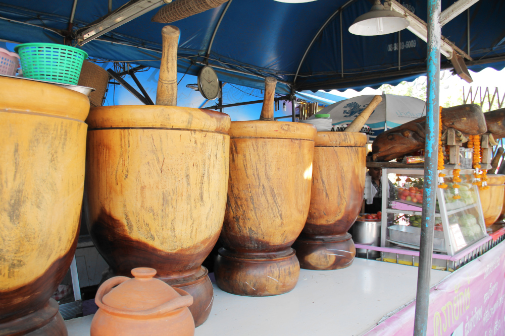 Jättimortteleita papaijasalaattikojulla. Luulen näiden olleen myynnissä koristeeksi toisille papaijasalaattikauppiaille kojuihinsa, joissa salaattia valmistetaan tuollaisissa, mutta pienemmissä mortteleissa.